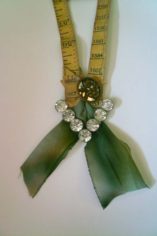 The bracelet was created with vintage Cracker Jack Prizes, one of many of my obsessions ! I keep adding new charms to it and now I don't want to wear it but hang it on the wall. The last photo is a necklace I created using an old linen tape measure used for measuring the bellies of Cows, (yea I know where in the world did I find that ) vintage buttons, ribbon and an old rusty tin plate thingy.